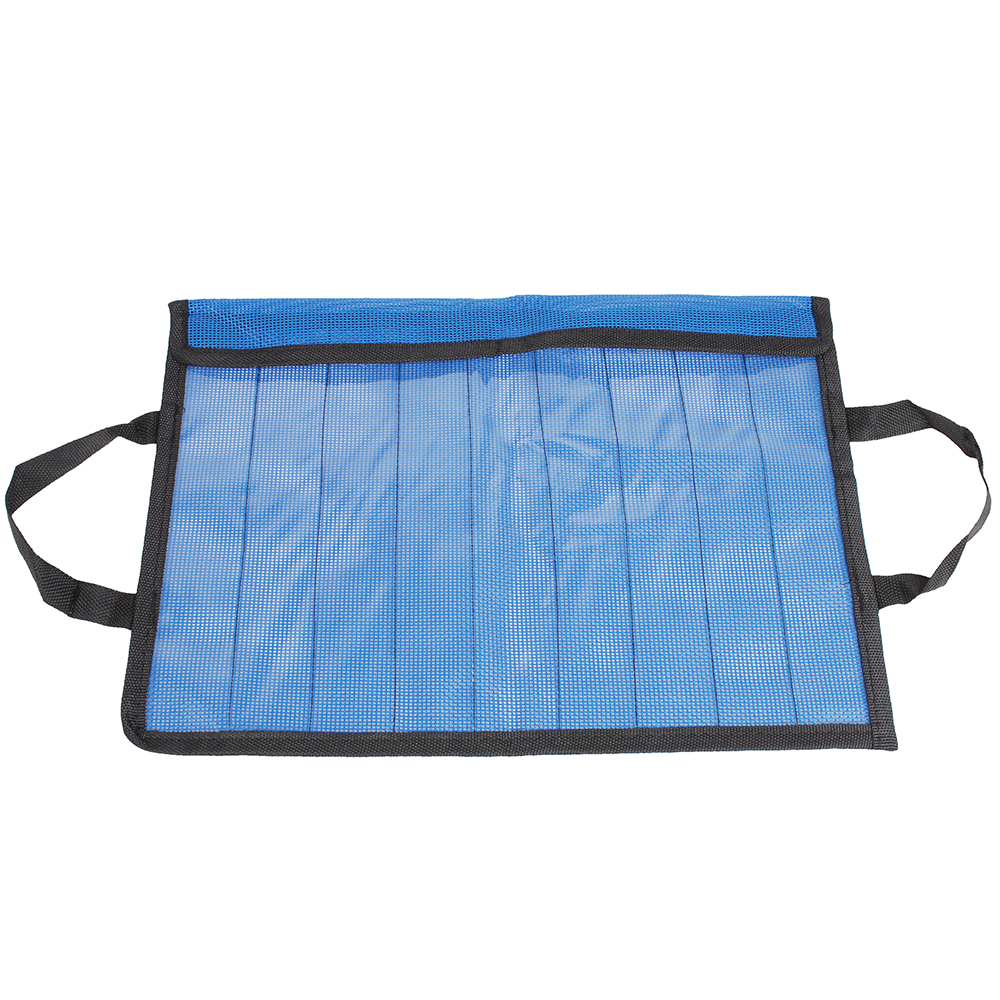 The bag is designed to hold metal jig lures in place, features 9 pockets which are about 40mm-wide and 260mm-deep. Plastic mesh outer and PU inner cover. Velcro strap tie for security.