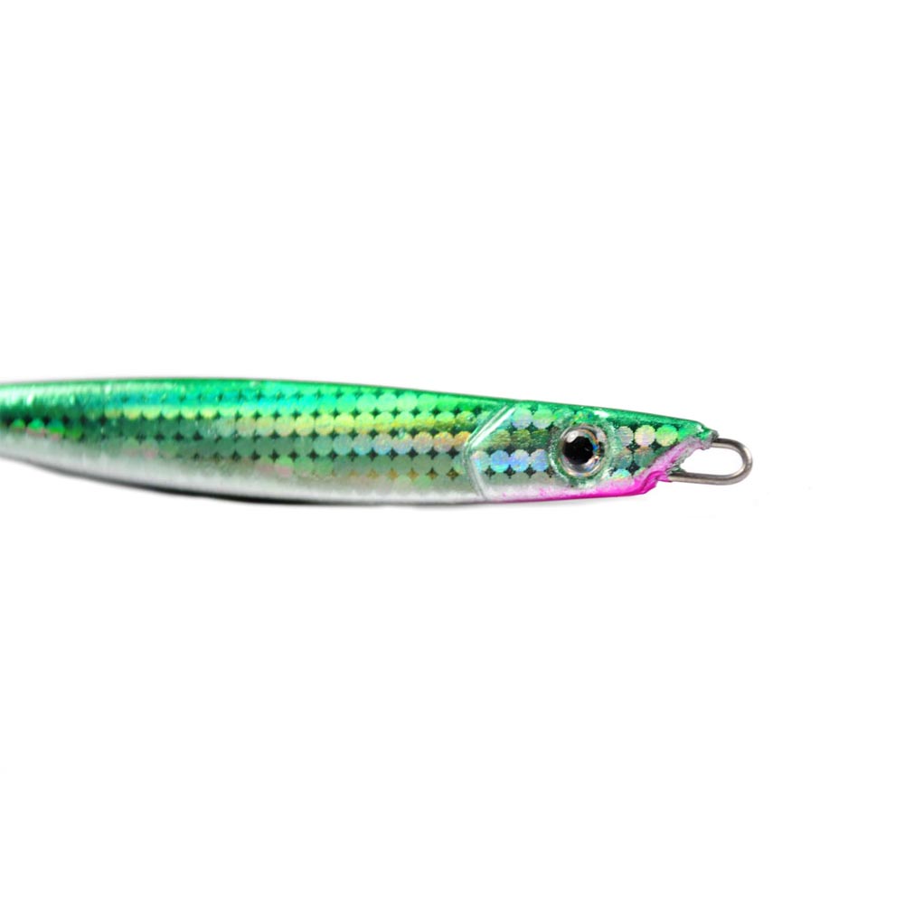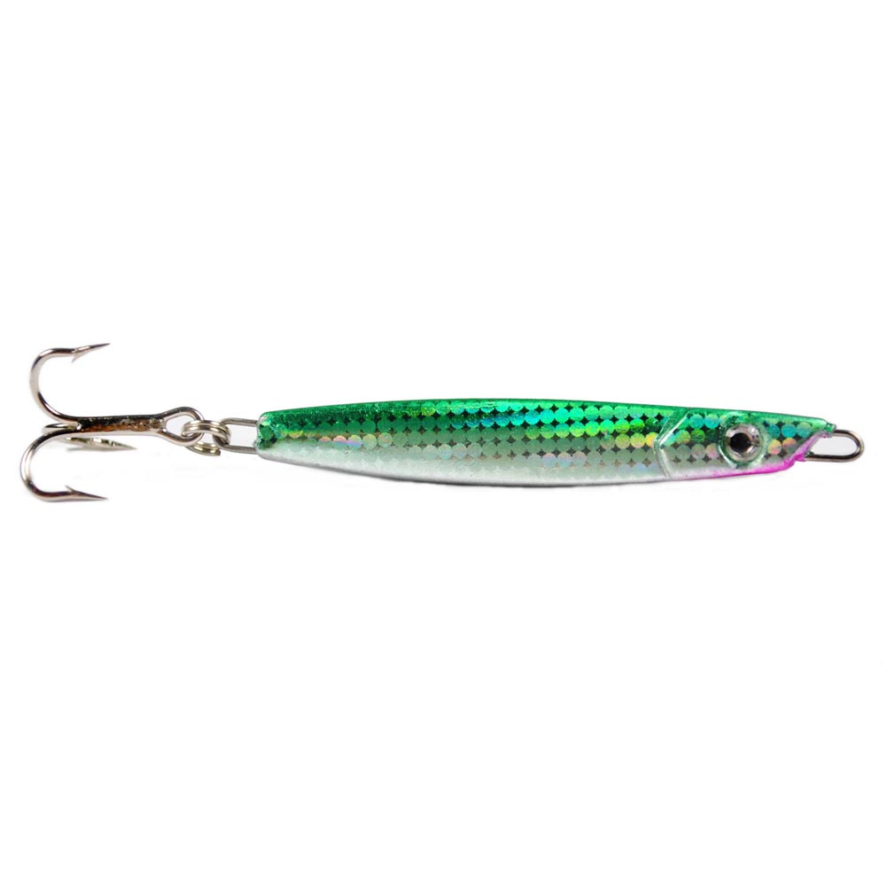 Outfitted with high-quality components, this jig spoon produces tempting swimming action both on the drop and the retrieve. With vivid 3-D eyes, its mini flat body is completely featured with terrific holographic finish. This reflective foil brings multiple species from all directions. And the super-shark treble hooks seal the deal.