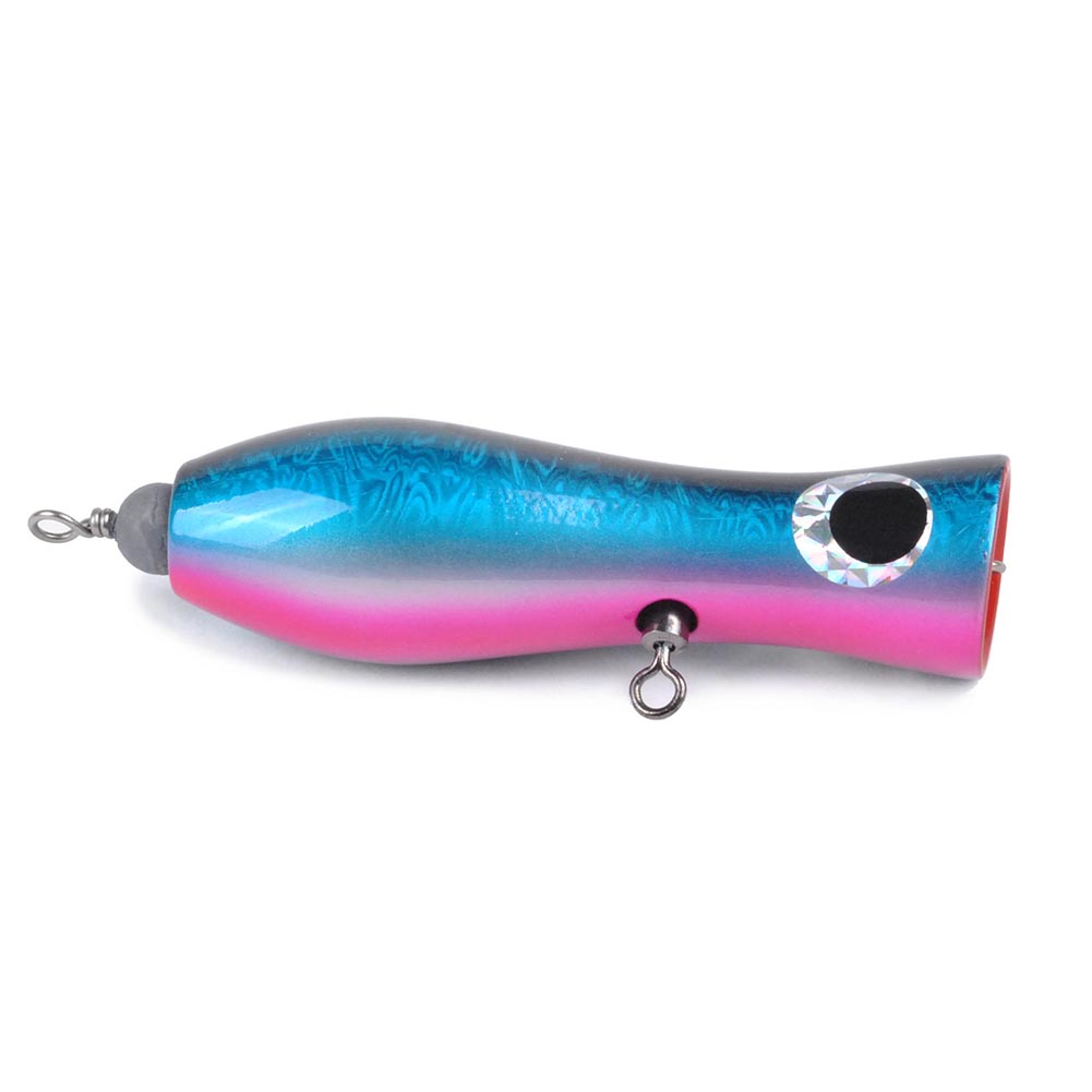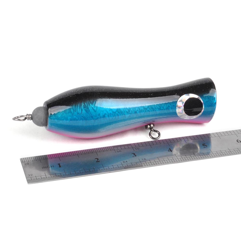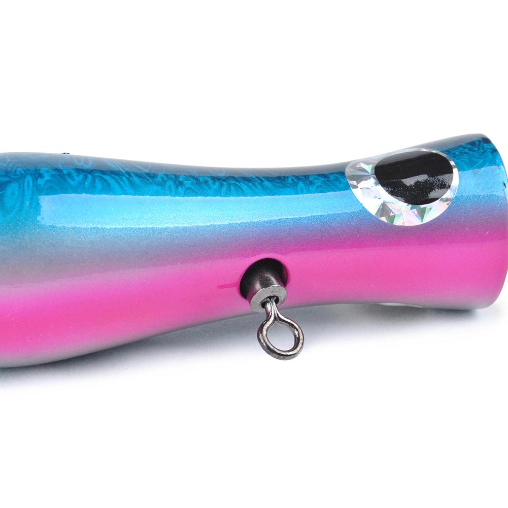 Constructed from solid hardwoods selected for the best density and buoyancy. A unique through-body stainless steel wire and swivel system for consistent strength when fighting. Along with the crazy splash and pop action, this highly detail painted lure triggers trophy strike one after one. The special rear weighted dumbbell is designed for extra long casting distances and a steady retrieve.